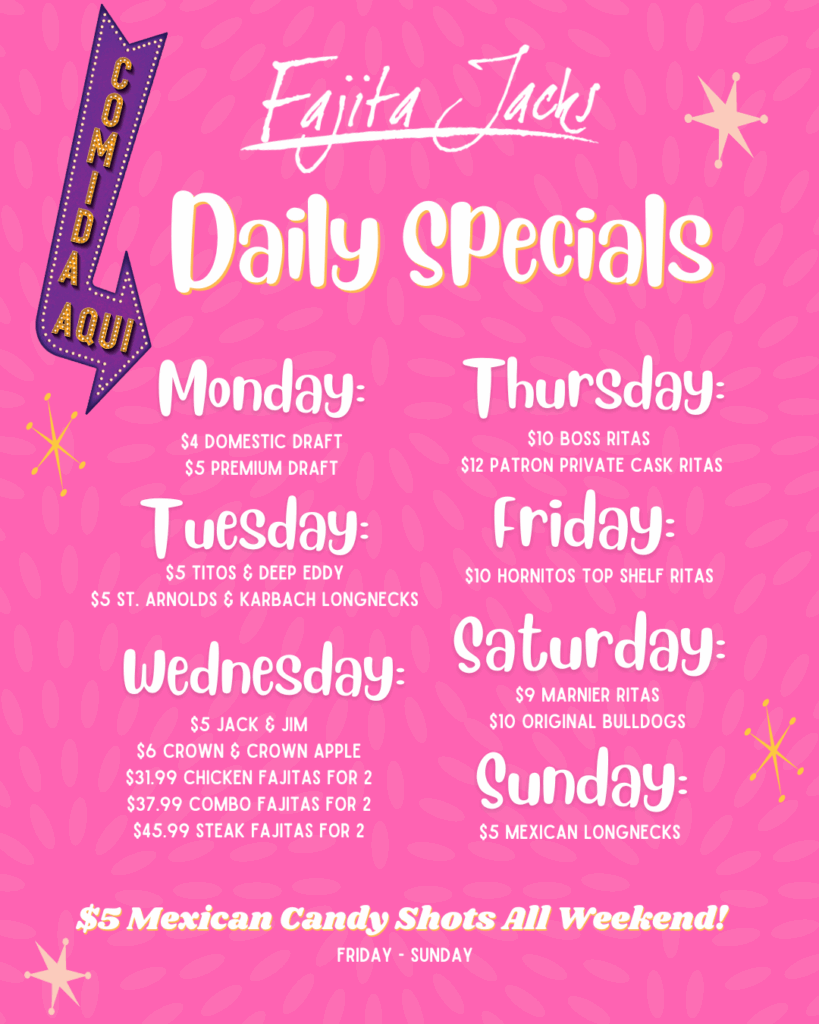Craving bold flavors, great vibes, and unforgettable views? Fajita Jack’s is your locally owned and operated Tex-Mex Grill & Cantina, serving up lakeside fun, live entertainment, and everyday deliciousness.